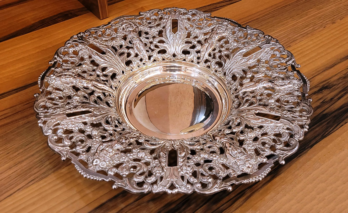 Это изысканное посеребренное блюдо выполнено в Испании в 50-х годах.