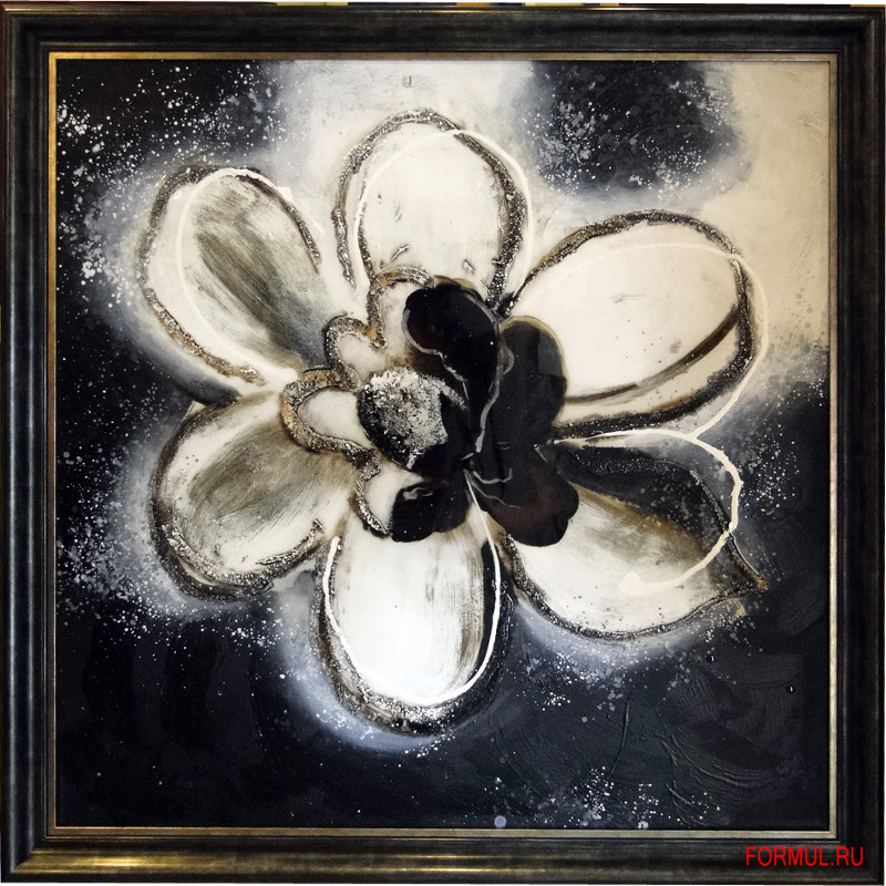 На панно изображён роскошный белый цветок с чёрным элементом в середине. Оформлено панно в изумительную деревянную раму, которая гармонично дополняет само изображение.