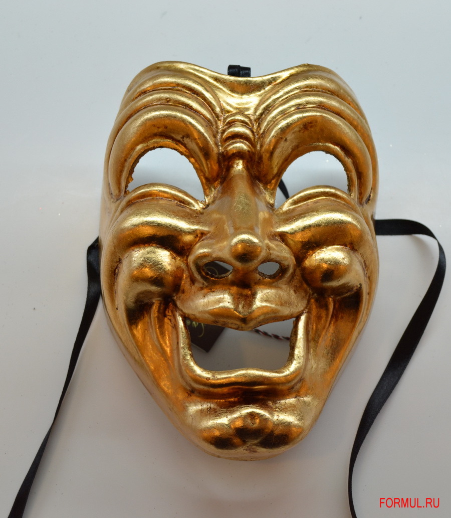 Венецианская маска 424 Tragicomica foglia oro выполнена из папье-маше и украшена сусальным золотом. Она является примером традиционной итальянской маски, созданной вручную.