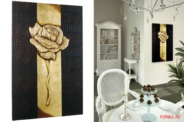 Настенное панно размером 110 ? 70 см, выполнено из черного МДФ с искусственно созданной текстурой под кожу аллигатора. Дизайн панели визуально разделен на три вертикальные зоны: первый и третий сегменты оформлены черным МДФ с выразительной текстурой кожи, а средний сегмент украшен тонкой золотой линией, на которой изысканно изображена золотая роза, гармонирующая с золотым фоном. Такое панно сочетает в себе элегантность минимализма и эффектный декоративный акцент, идеально подходит для современного интерьера.