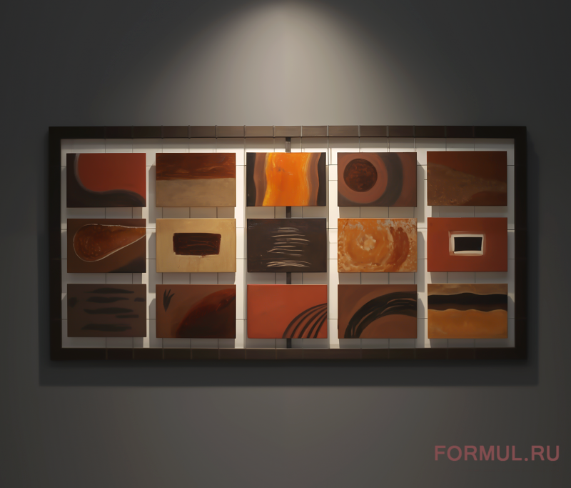 Пятнадцать различных абстрактных картин, интересные цветовые фантасмагории внутри строгой деревянной рамы как бы подвешены в воздухе – эффект потрясающий.