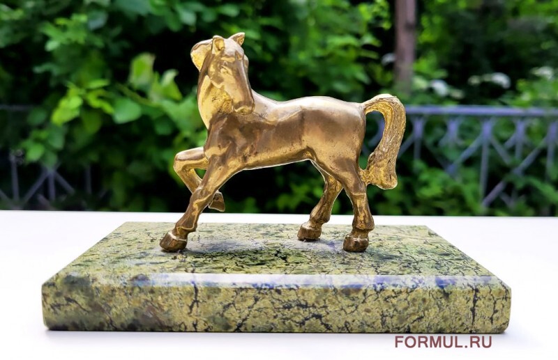 Змеевик, или серпентинит, представляет собой камень зеленого цвета, который придает подставке неповторимый характер и отлично сочетается с латунью, из которой выполнен конь.