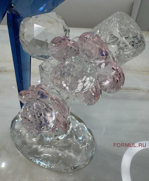 Птица сидит на стеклянной веточке, украшенной прозрачными и розовыми декоративными элементами. Основание устойчивое и тоже выполнено из фактурного стекла.