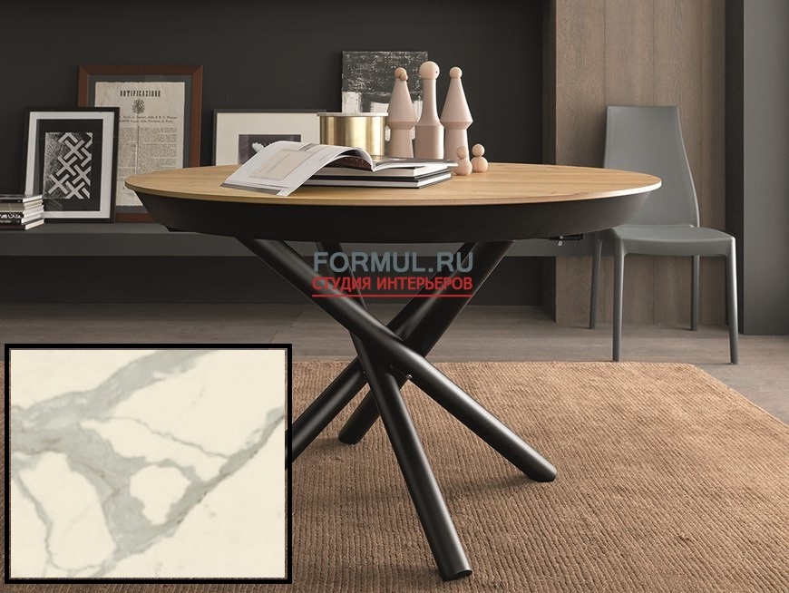 Стол с керамической поверхностью, сделанной под мрамор, станет настоящей находкой для лаконичных, небольших гостиных комнат и кухонь.