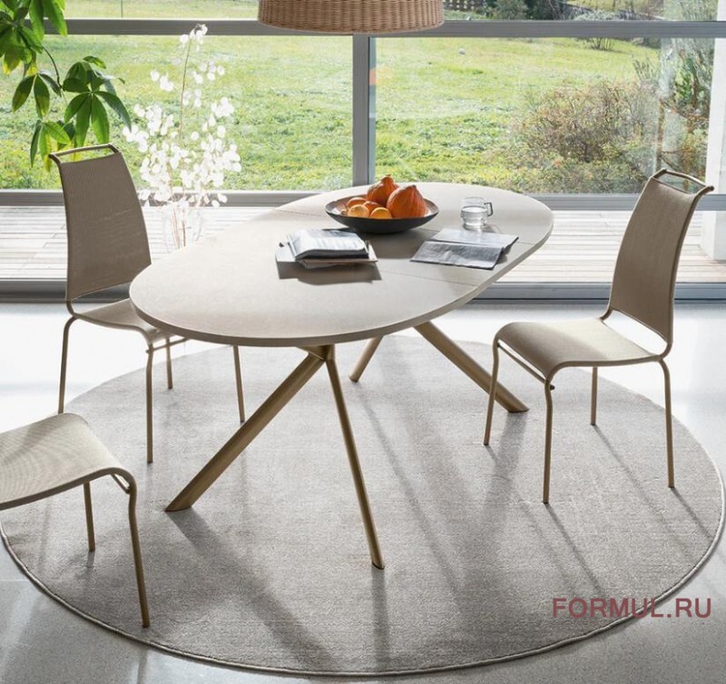Стол выполнен с овальной столешницей с керамическим верхом в цвете p2c, имитирующим белый мрамор. Центральная вставка-"бабочка" цвета p94 гармонично сочетается с основным цветом столешницы, обеспечивая эстетическую целостность даже в разложенном состоянии.