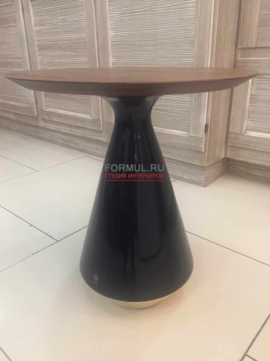 Представьте себе: плавные линии, где насыщенное золото основания грациозно переходит в глубокий чёрный оттенок. А сверху вас ждёт тёплая текстура ореха каналетто — круглая столешница диаметром 45 см, которую так и хочется коснуться рукой, чтобы ощутить текстуру дерева.