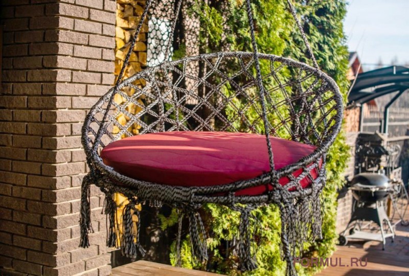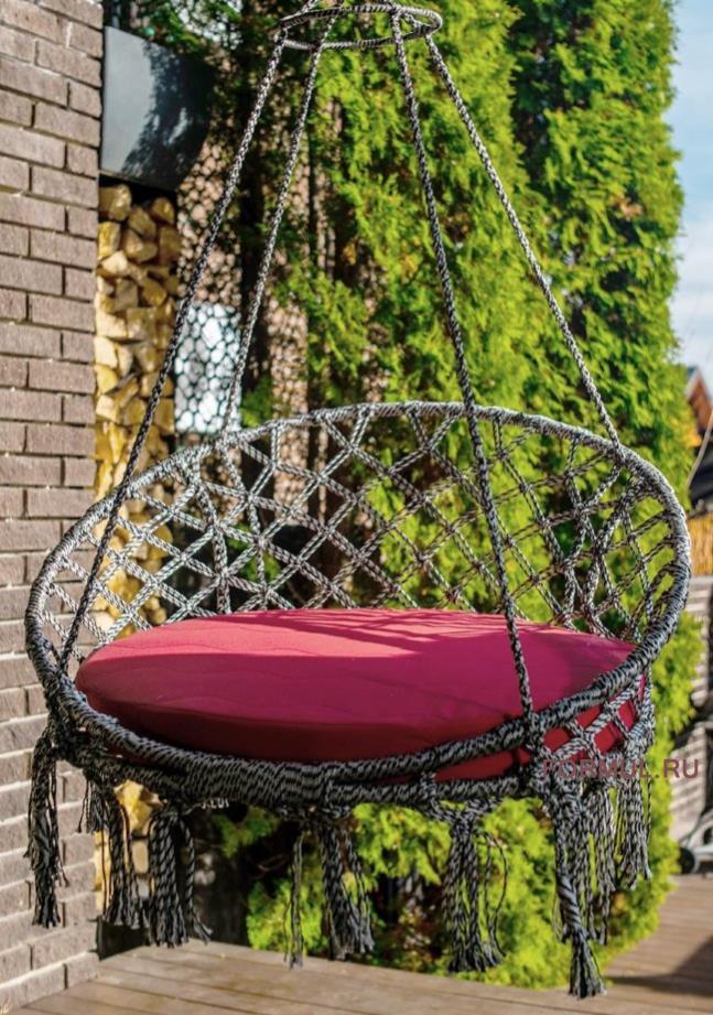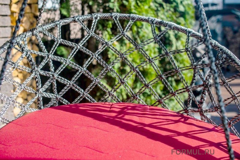 Удобное кресло дополнено большой подушкой с чехлом из ткани с водоотталкивающей пропиткой. Основа подушки дана в форме круга, очень эффектно будет смотреться у Вас на террасе, или в саду. Вместо тканевого полотна для кресла качели АРУБА дизайнеры употребили узелковое кружево, выполненное из прочной полиамидной нити по всем правилам техники «макраме».