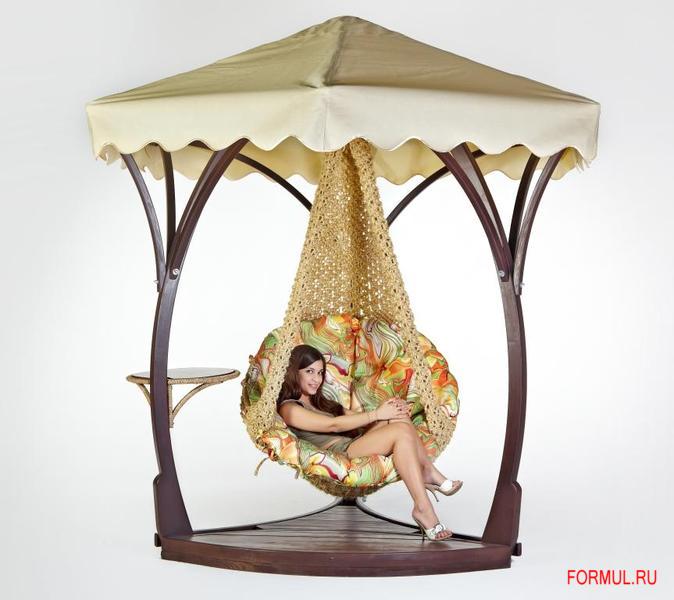 -крышей изготовленной из немаркой и водонепроницаемой ткани, которую поддерживают изящные деревянные опоры. Она нежно защитит сидящих в гамаке от дождя, снега и т.д.