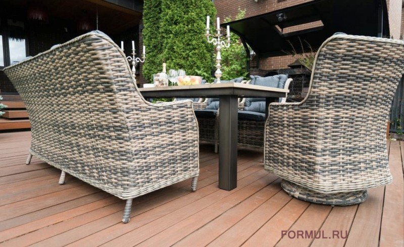 Комплектация: 1- обеденный стол, 1- 3-х местный диван с подушками, 3 — кресла с подлокотниками и подушками, 2 — кресла с вращающимся механизмом с подушками