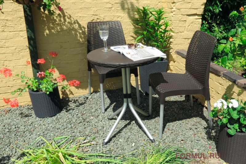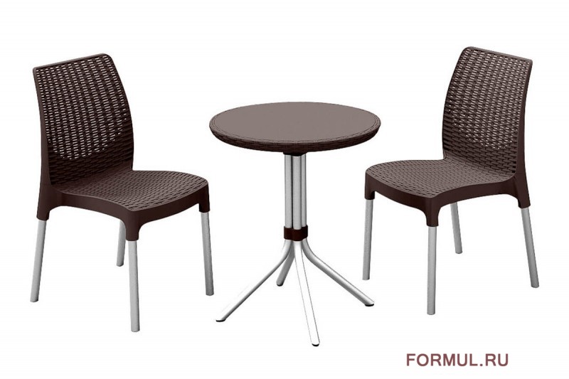 Компактный и недорогой комплект мебели на две персоны из пластика состоит из круглого столика и двух стульев с металлическими ножками Chelsea от компании KETER порадует любителей плетеной мебели своей фактурой в стиле ротанг.