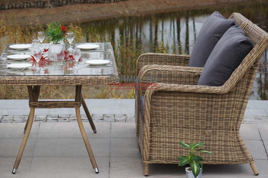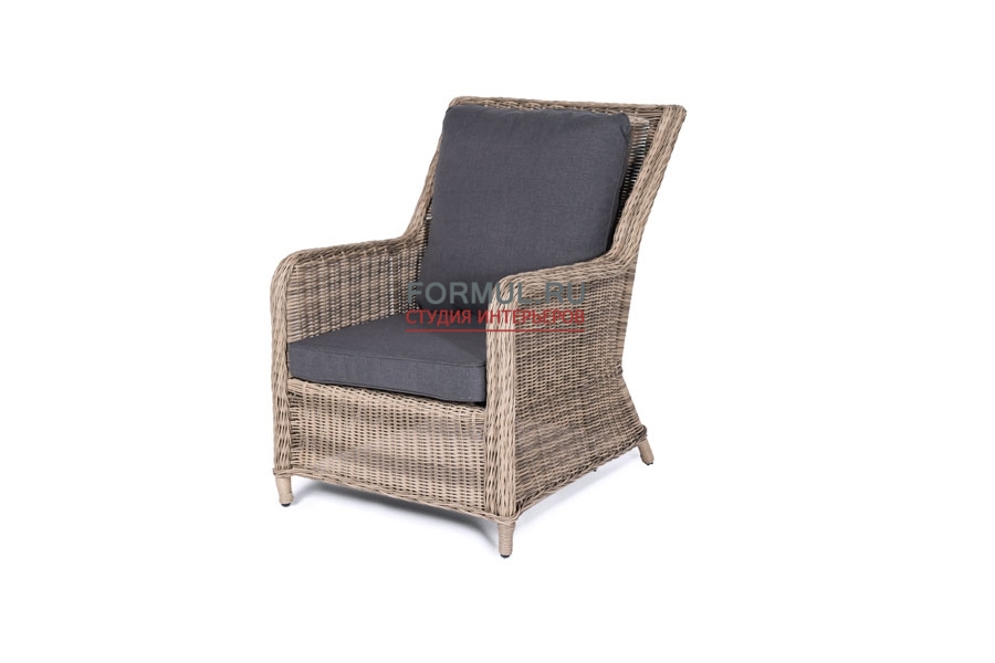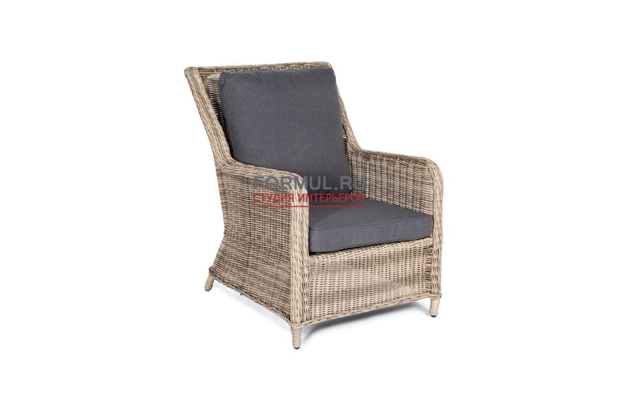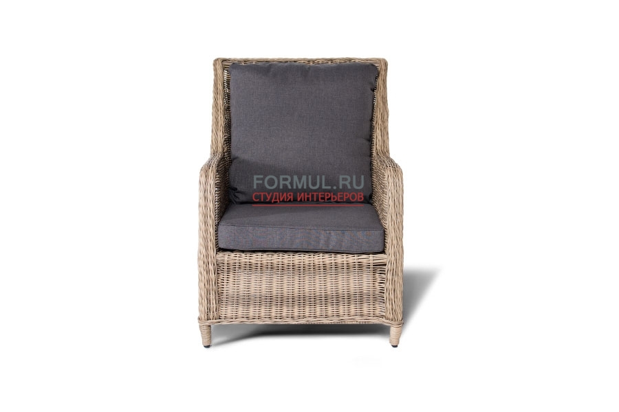 Кресло "Гляссе" преподнесен сподушками в комплекте, каркас выполнен из алюминия, искусственный ротанг выполнен ручным круглым плетением.