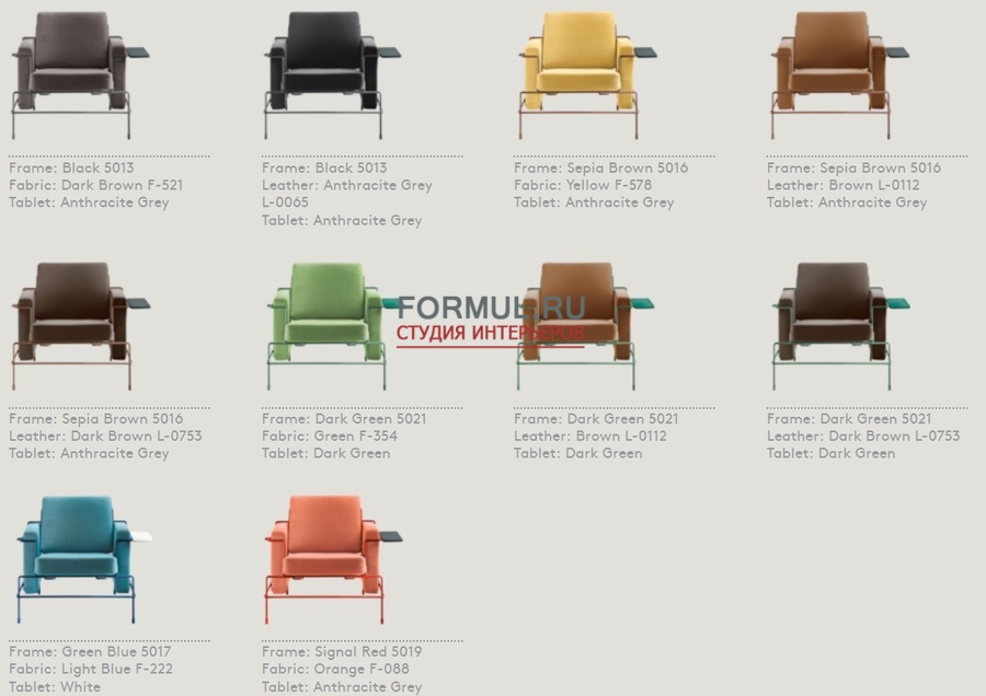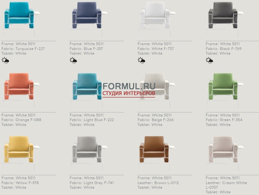 Материал: рама из стального стержня, окрашена в полиэфирный порошок . Подушки из вспененного полиуретана со съемным покрытием в ткани или из кожи. Версии для использования на открытом воздухе.