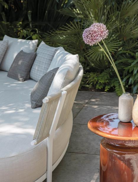 Прочная алюминиевая рама с порошковым покрытием связана с акриловой веревкой, сплетенной вручную и устойчивой к атмосферным воздействиям. Мягкая и изысканная привлекательность материалов сочетается с извилистыми и изящными формами модульного дивана Loto, придавая комнате особый и неповторимый оттенок. Подушки сиденья и спинки изготовлены из специально разработанной системы набивки, которая позволяет воде стекать и воздуху проникать, сохраняя объем с течением времени и повышая комфорт амортизации.