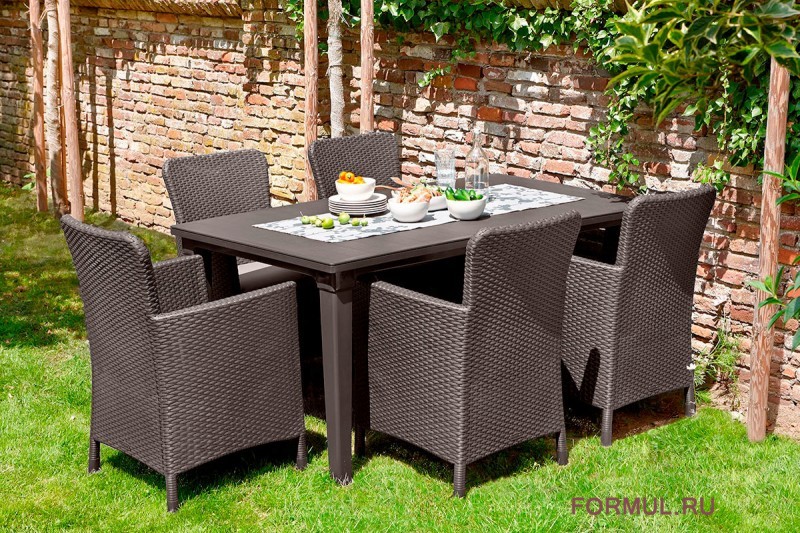 Удобный и прочный пластиковый стол Futura на 4-6 человек без стекла от компании KETER порадует любителей плетеной мебели своей фактурой в стиле ротанг.