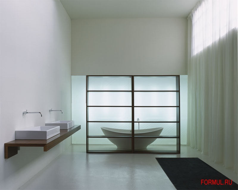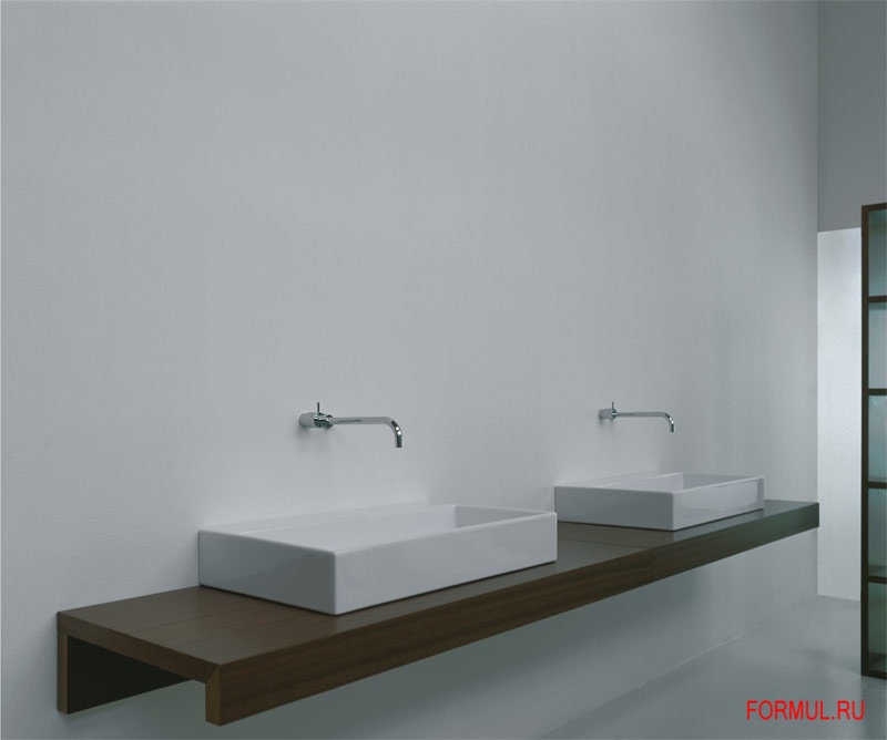 Белая керамическая раковина, доступная в двух разных размерах. Особенностью является его скрытый дренаж. Он может быть прикреплен непосредственно к стене, с помощью скобок, либо размещены на деревянной столешнице. Кран на полу или стене. Дизайнер Matteo Thun.