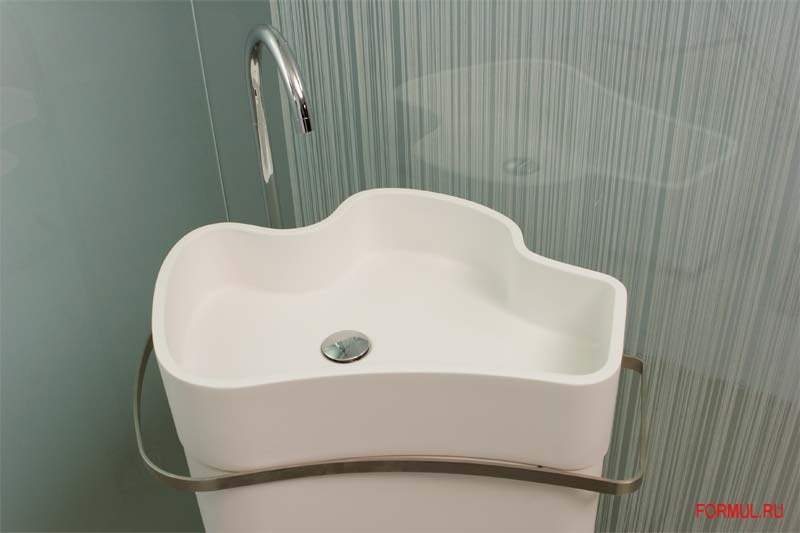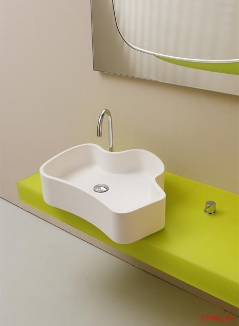 Умывальник в форме цветка, реализованного в cristalplant белый. Он может сочетаться c умеренно крашенным стеклом или в полке из древесины. Кран в стене или на полке под раковину. Дизайнер Marco Piva.