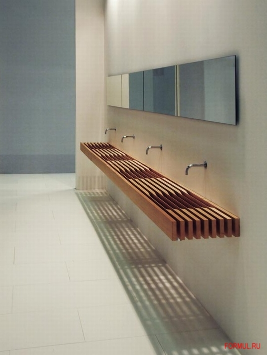 Поверхности раковины могут быть использованы в качестве скамейки или стеллажей для хранения.Умывальник изготовлен из нержавеющей стали с поверхностью из массива древесины лиственницы.
