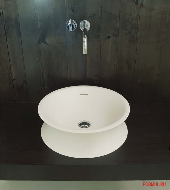 Умывальник круглой формы в белом бархате или в португальском известняке. Это может быть в сочетании с деревянной столешницей или со столом, который изготовлен в классическом стиле. Отводы на стене или на полу. Дизайнер Luca Scacchetti.