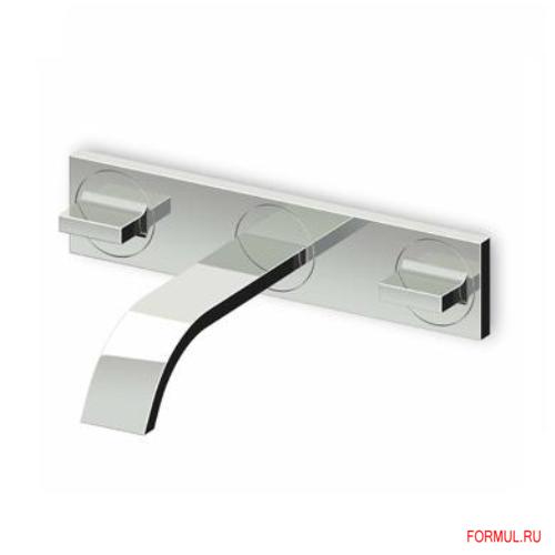 На три отверстия. Монтируется на стену. Скрытая установка. Требуется скрытая часть. Фиксированный излив. Без донного клапана. Поверхность: хром. Оснащен накладкой.
