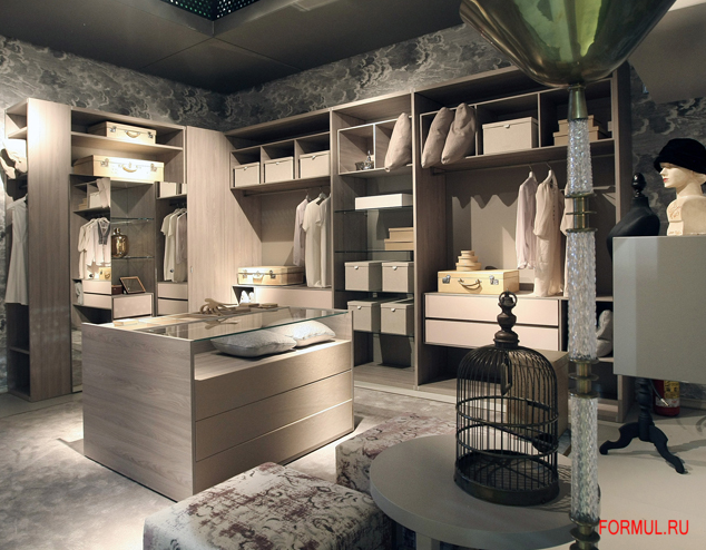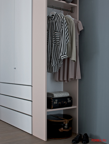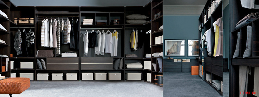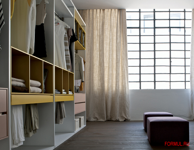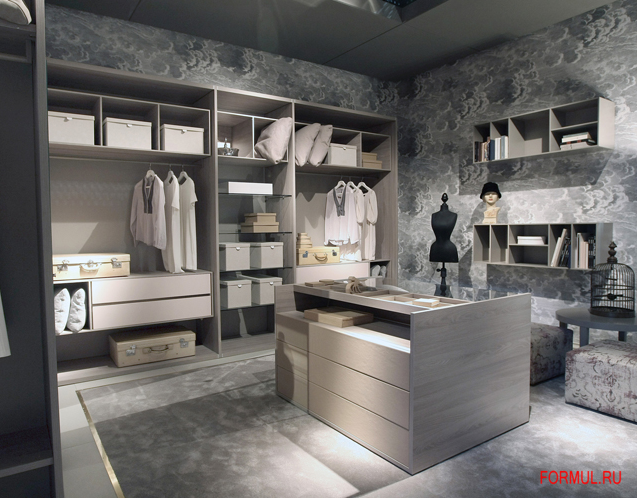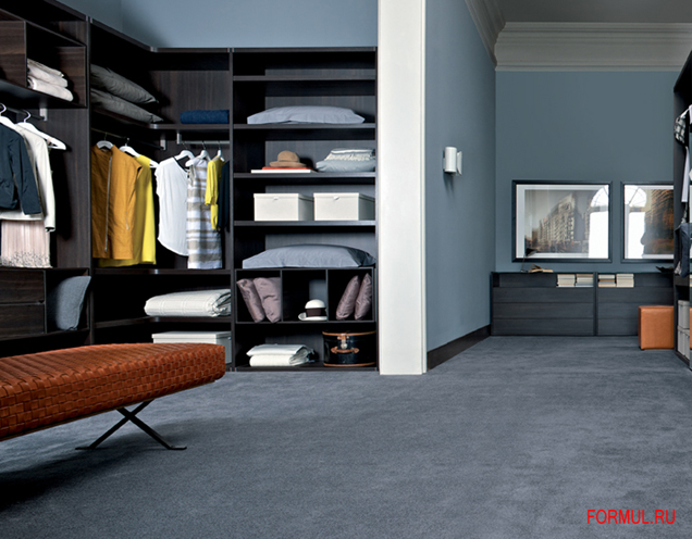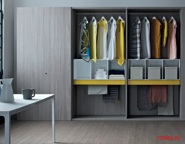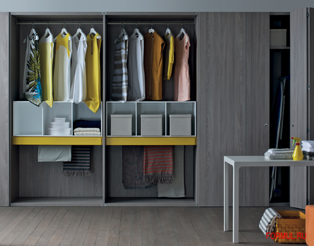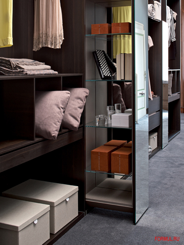 Равноценность форм и элегантности. Вот почему внутри кабины шкафа можно создать не больше не меньше чем персональный спортзал. Теплая и полная света отделка, обволакивающая уютом. Шкаф-кабина оборудован широким выбором аксессуаров, включая задние спинки, изолирующие от стен. Тут можно хранить развешенную, сложенную и упакованную одежду. В стене можно высечь место для хранения летней или зимней одежды. Большая практичность также благодаря тумбочкам на колесиках, которые могут извлекаться из шкафа, создавая новые комбинации пространства.