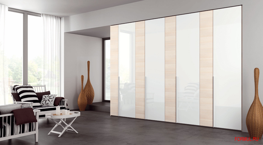 Платяной шкаф с восемью чередующимися дверями разного размера из современной коллекции SESTANTE от итальянской фабрики Mercantini. Узкие створки этой модели выполнены из древесины под светлый клен. Широкие двери покрыты глянцевым белым лаком. По запросу покупателя, цвет древесины и лака может быть изменен на любой из представленных в каталоге.