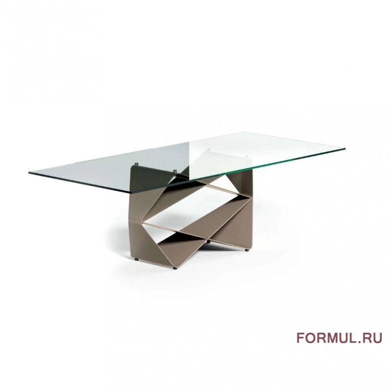 Основание стола выполнено из металла, что придаёт ему прочность и современный вид. Оно может быть однотонным или двухцветным, например, в сочетании бронзы и шампанского, что добавляет интерьеру дополнительный акцент. Геометрические линии основания подчёркивают динамику и создают ощущение лёгкости, несмотря на массивность конструкции.