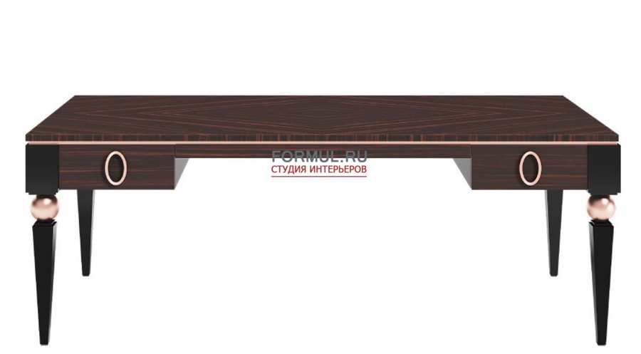 Стол письменный Korp от фабрики Capital Collection, отделан эффектными экзотическим массивом зебрано, перекрытым несколькими слоями сверкающего лака. У него легкая конструкция на позолоченных шарах, с двумя встроенными ящиками, которую поддерживают оригинальные, усеченные ножки.