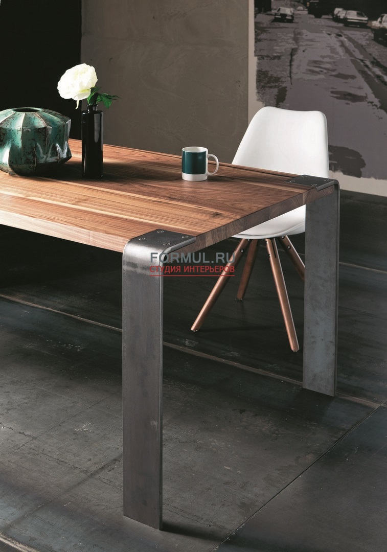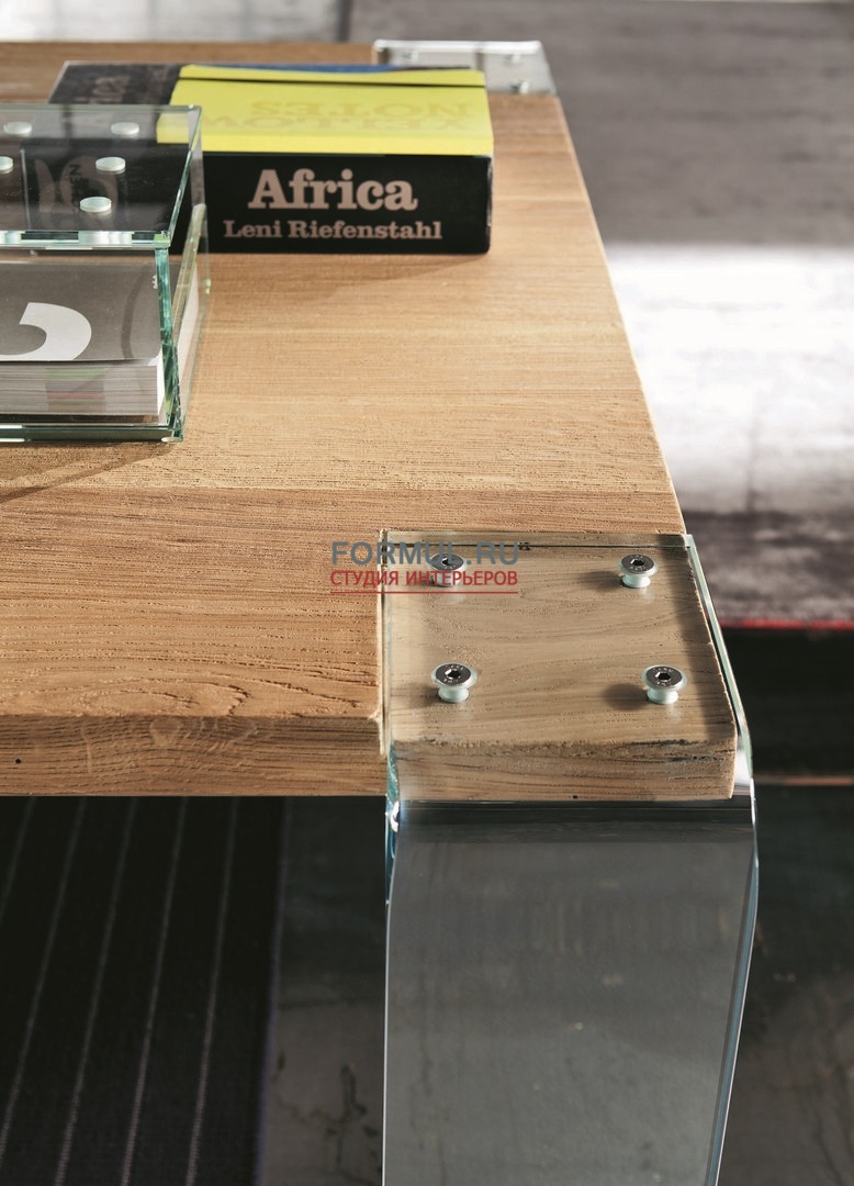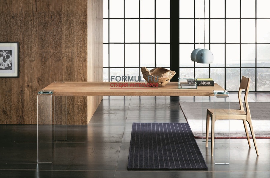 Стол со столешницой из дерева , 4 ножки могут быть выполнены из стекла или стали .