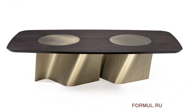 Обеденный стол с основанием из гнутого сверхпрозрачного стекла толщиной 15 мм с отделкой под бронзу или с матовой отделкой: латунь, темная латунь, титан.