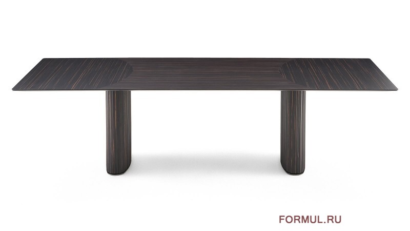 Основание стола состоит из овальных блоков, покрытых цельной фрезерованной древесиной в отделке «Ebano Capri», с акцентами из чёрного хромированного металла, что подчёркивает современный и утончённый стиль изделия. Такая конструкция обеспечивает не только стабильность, но и служит выразительным декоративным элементом, придающим столу скульптурную выразительность.