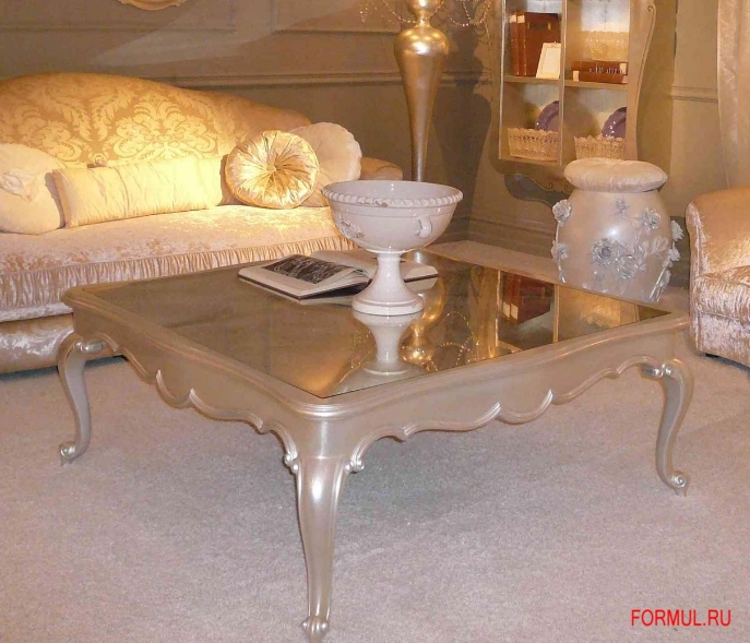 Прямоугольная столешница дополнена зеркальной поверхностью и украшена резной царгой.