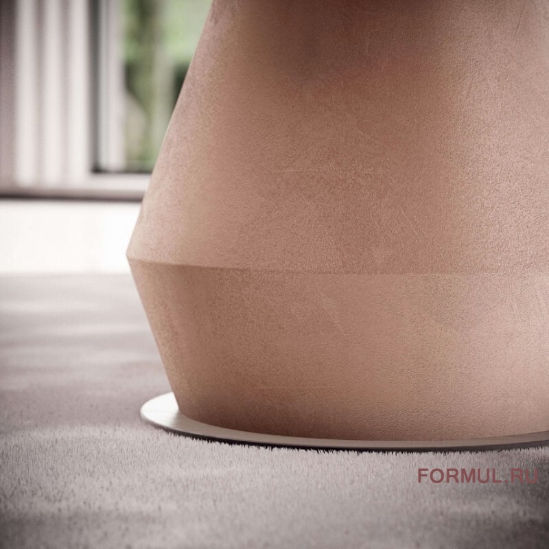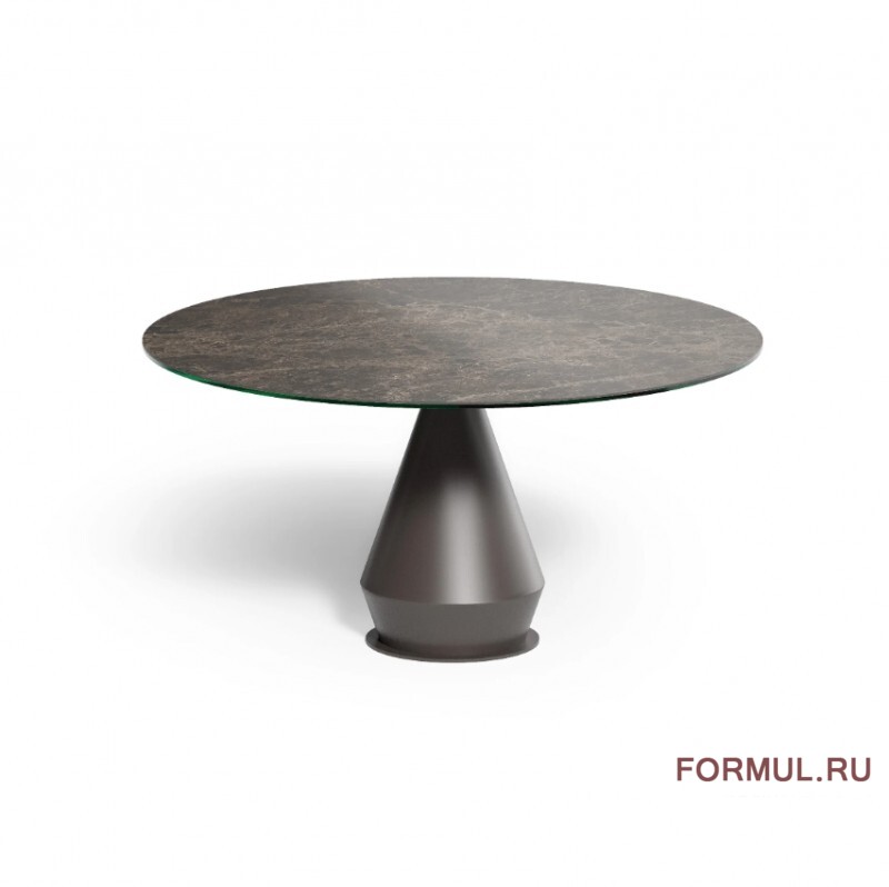 Круглая столешница диаметром 150 см доступна в различных вариантах отделки, включая керамику, матовое стекло и мраморное стеклоью. Основание стола выполнено из лакированного металла или бетона в скульптурной форме, напоминающей шахматного слона, что придаёт ему уникальный визуальный акцент и освобождает пространство под столешницей для большего удобства.