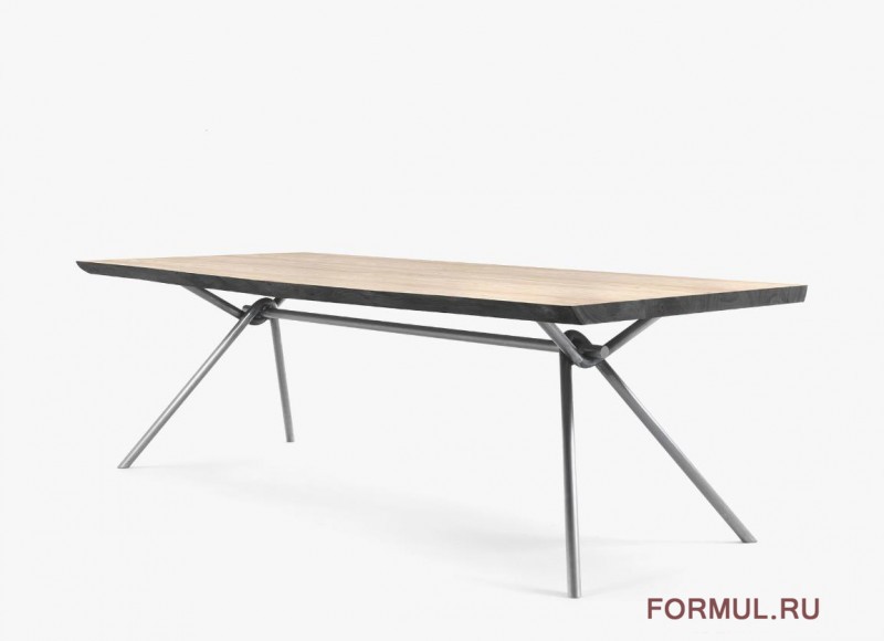 Стол со столешницей из клееного массива дерева, с естественными или прямыми сторонами, в сочетании с базовым и линейным основанием из переплетенного трубчатого железа, пустым внутри. По запросу возможно изготовление из цельного переплетенного трубчатого железа.