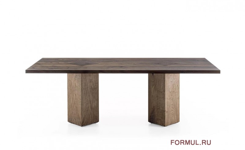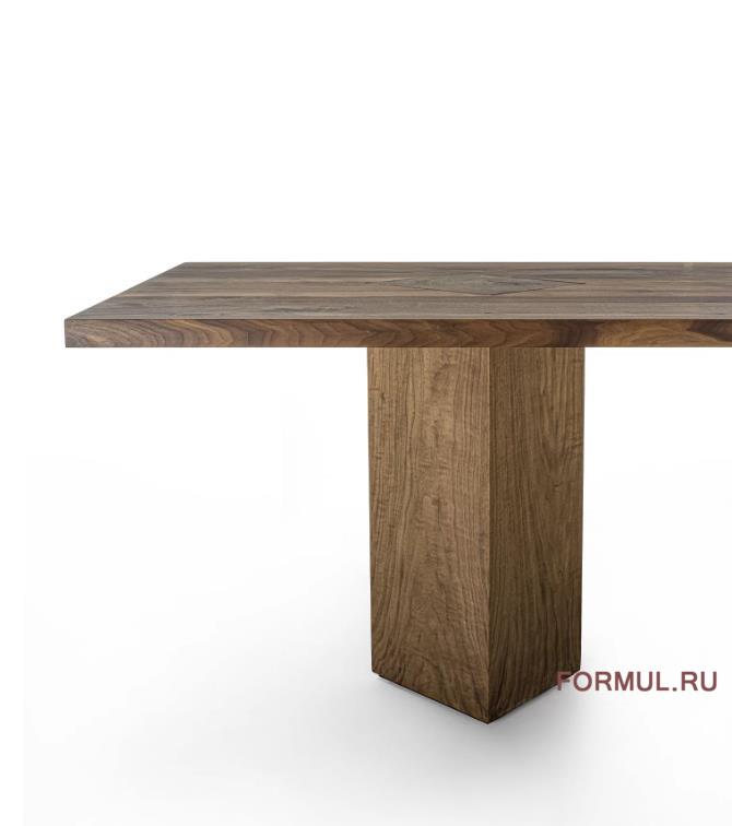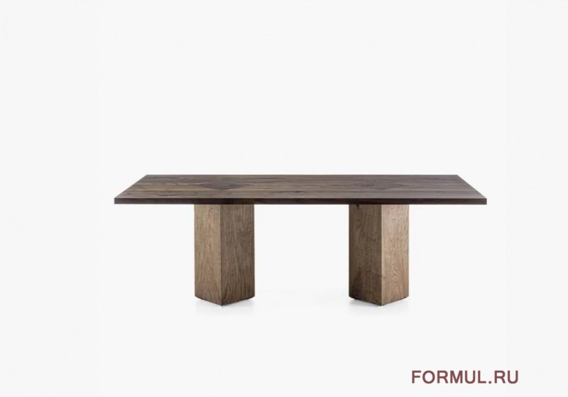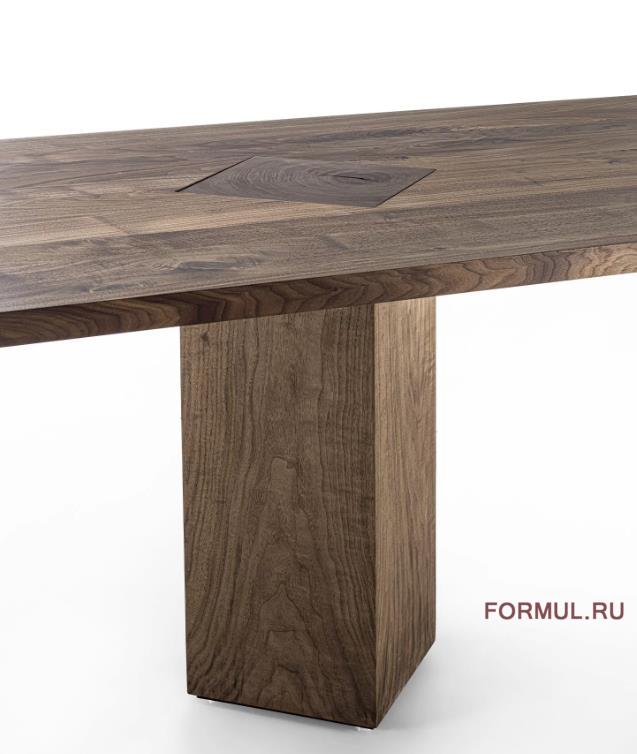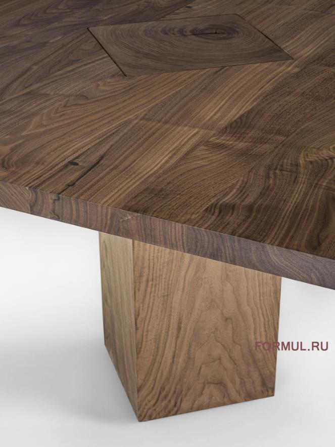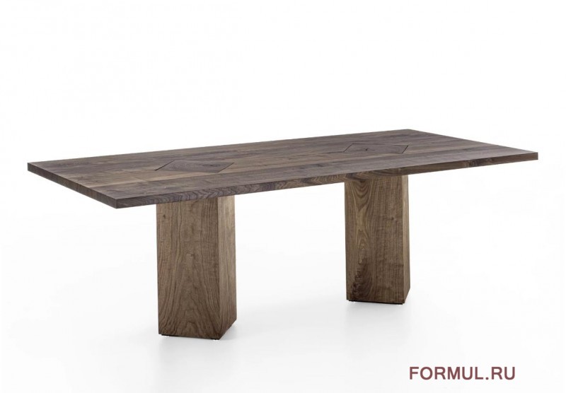 Стол с топом из массива дерева с клееными планками, характеризующийся открытыми ножками, пересекающимися с топом, изготовленным из отрезков ствола дерева, и поворачивающимися на угол 45°.