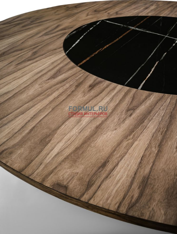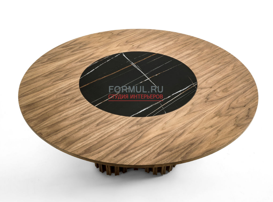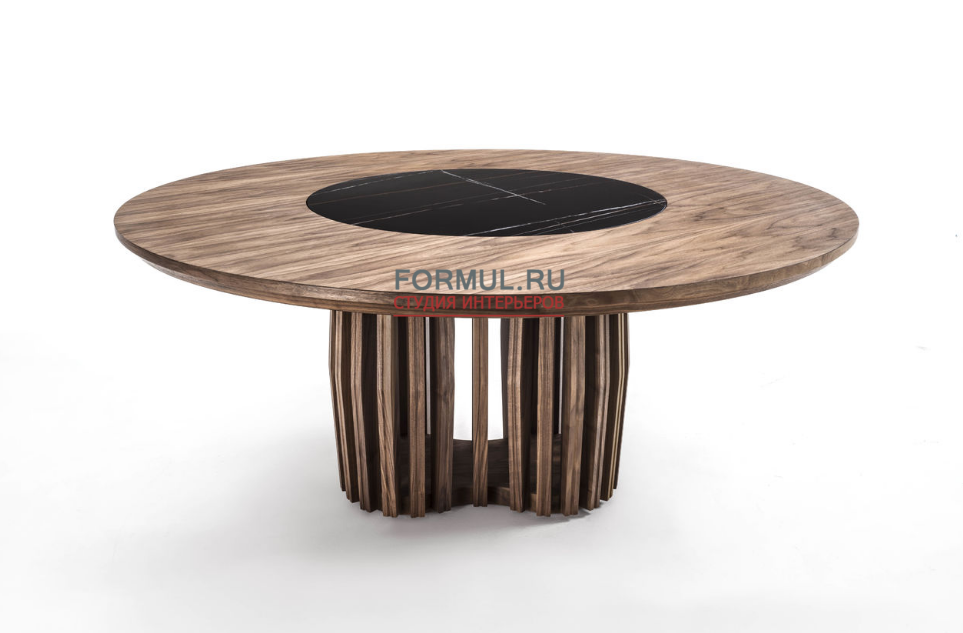 Круглый стол SHANG со столешницей из массива дерева. Мраморная вставка посередине оснащена поворотной системой Lazy Susan, благодаря чему стол удобно сервировать, а гостям не придётся тянуться за блюдом. Основание из деревянных полос символизирует знак бесконечности. Отделан натуральным воском растительного происхождения с экстрактами сосны.