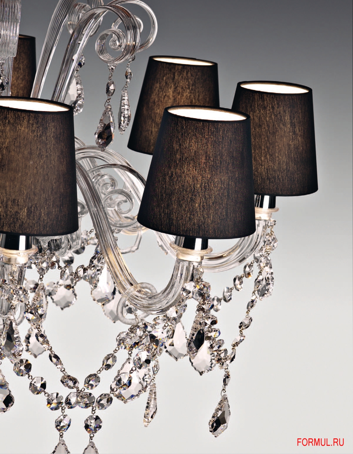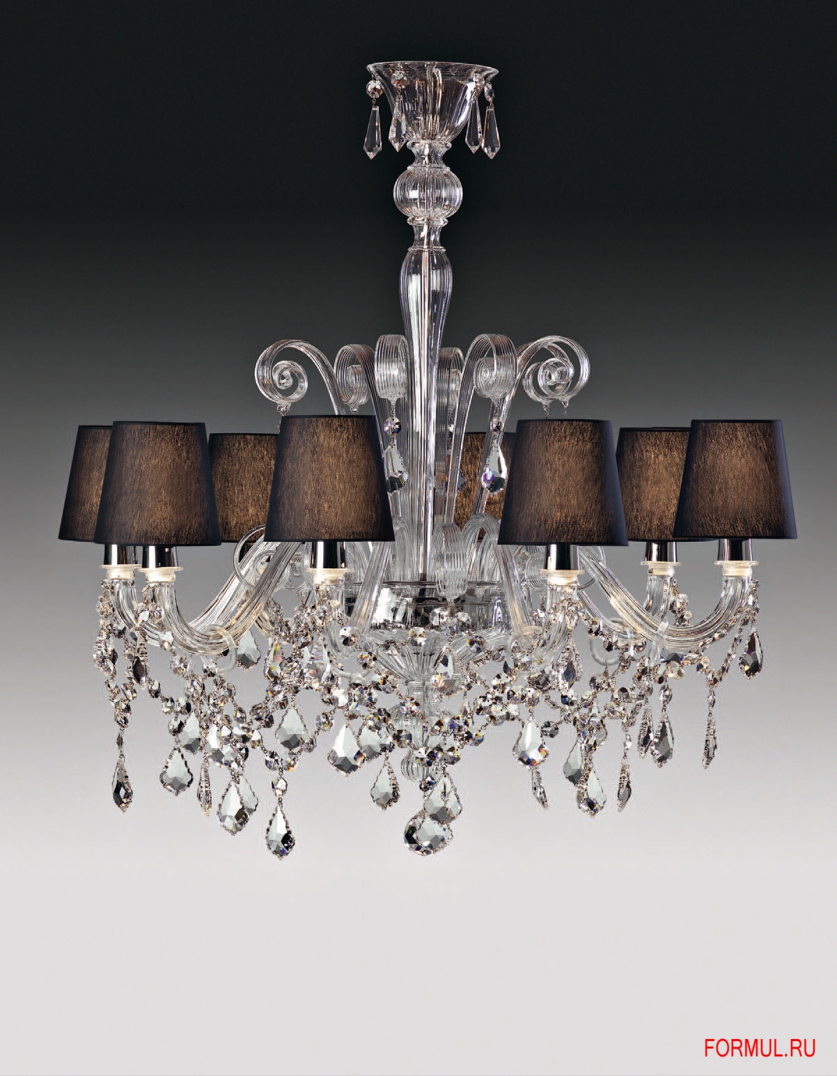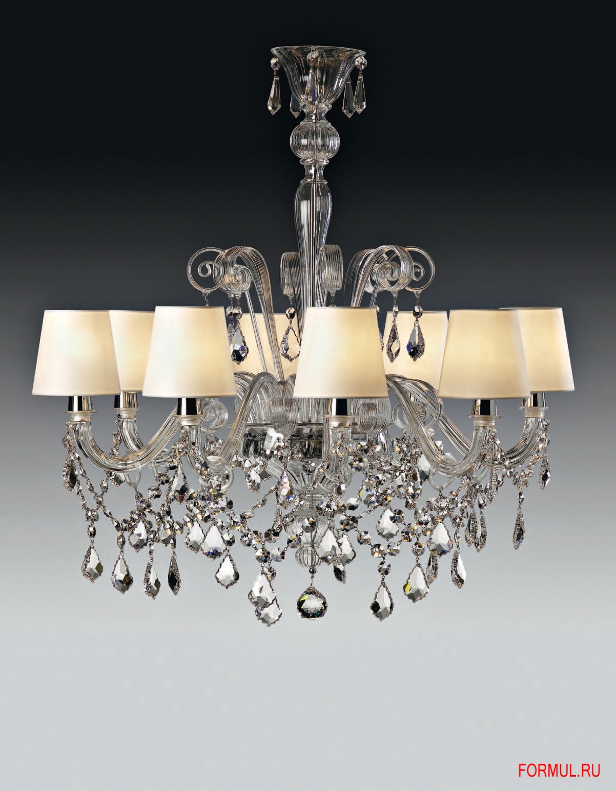 Люстра выполнена мастерами фабрики AVMazzega вручную из муранского(венецианского) стекла и тканевых абажуров.