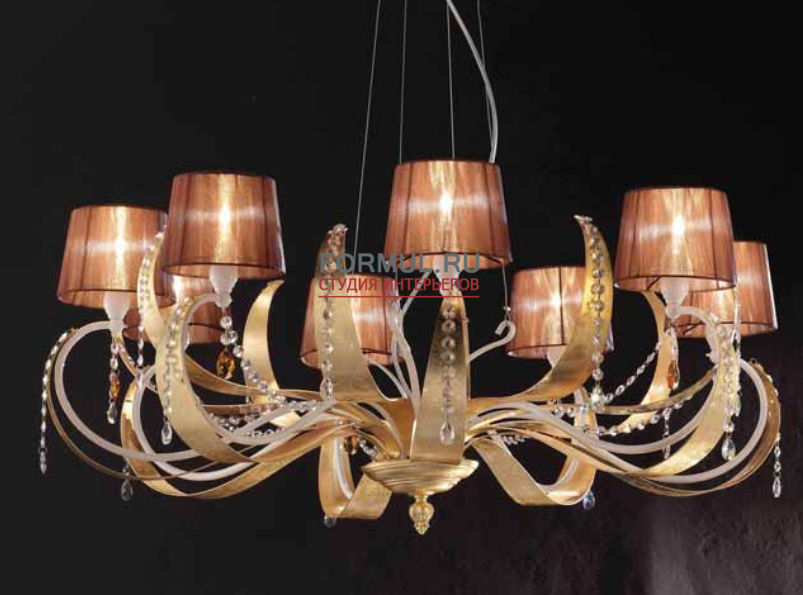 Люстра Erica на 8 ламп. Арматура из кованного вручную железа. Отделка – серебряная фольга+белая лакировка или золотая фольга+белая лакировка. Плафоны - органза.
