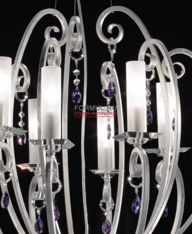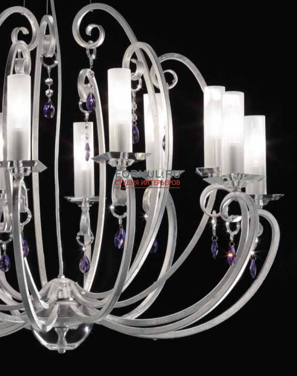 Люстра на 12 ламп. Арматура из кованного вручную железа. Отделка – серебряная фольга или золотая фольга.