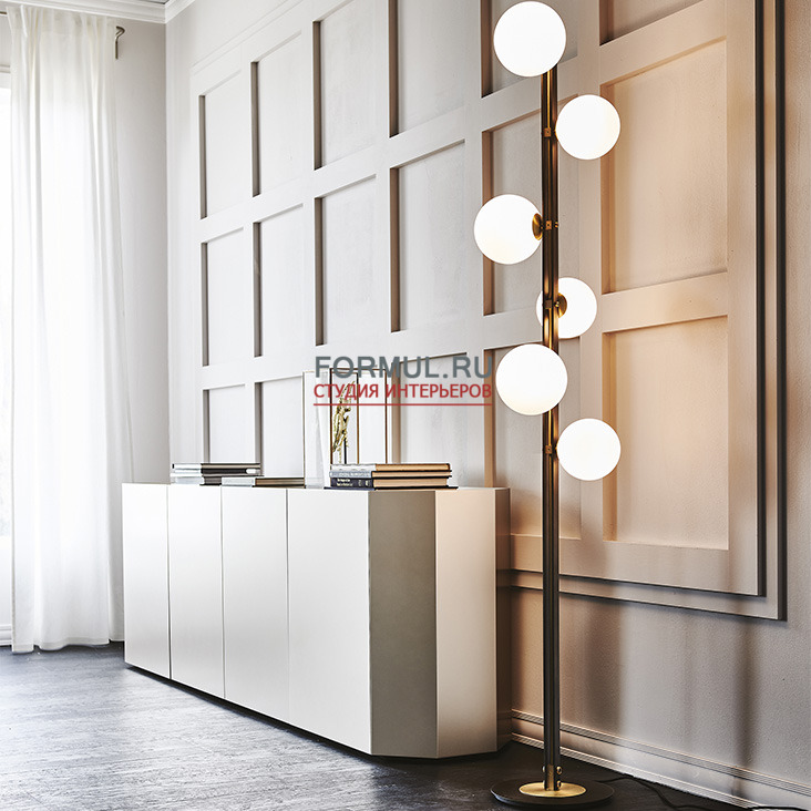 Настенный, настольный, напольный или потолочный светильник с основанием из полированной стали и деталями из матовой латуни. Абажуры из выдувного атласного стекла белого цвета.