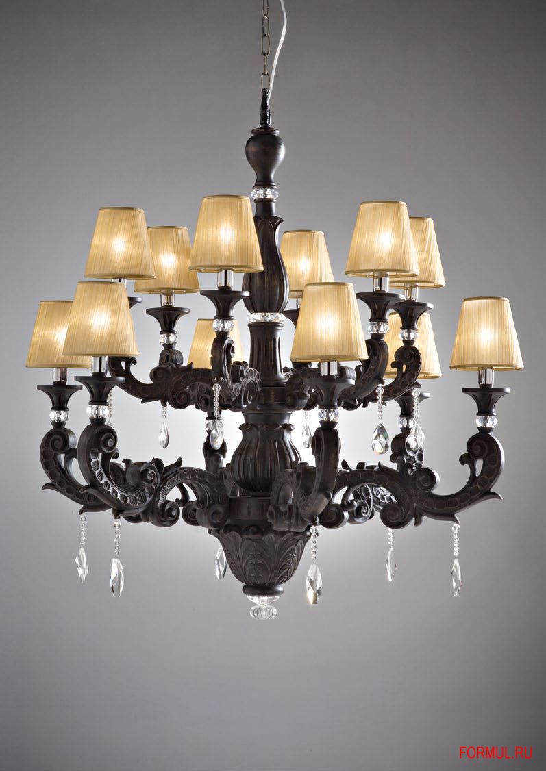 Деревянная люстра ручной работы в классическом стиле с 12 лампами. Линия Barocco. Предлагается 8 видов отделки и 2 вида абажуров в 3 цветах - конические или цилиндрические.
