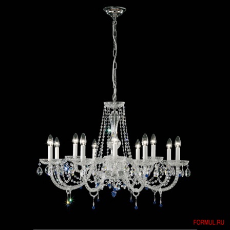 Модель разработана для домашнего помещения, великолепно дополнит интерьер в классическом стиле. Светильник рассчитан на 12 лампочек, с цоколем E14, одна лампочка с максимальной мощностью 40 ват. Каркас выполнен из металла. Дизайн дополняют хрустальные подвески и кристаллы Swarovski.