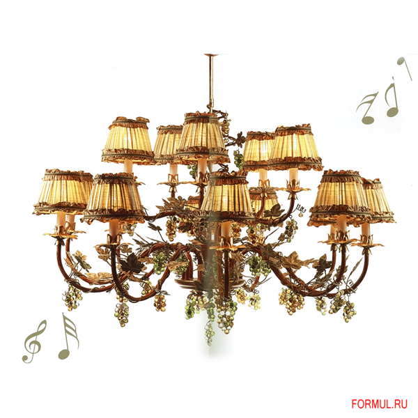 Люстра с абажурами из текстиля. Каркас украшен подвесками в форме гроздьев винограда (дутое стекло). Рассчитана на 12 ламп.