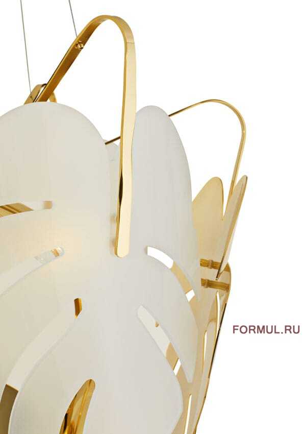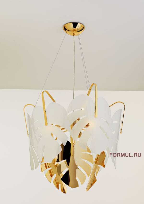 Особую изысканность Riviera приобретает благодаря уникальному сочетанию материалов: благородное золото гармонирует с матовым хрусталём, который мягко рассеивает свет четырёх ламп E27 (до 20 Вт каждая), создавая тёплую атмосферу с эффектом "золотого сияния". Стилизованные металлические листья на каркасе добавляют композиции лёгкости и природной гармонии, напоминая о средиземноморской растительности. При размерах 60x70 см светильник становится идеальным центром композиции, будь то обеденная зона или парадная гостиная.