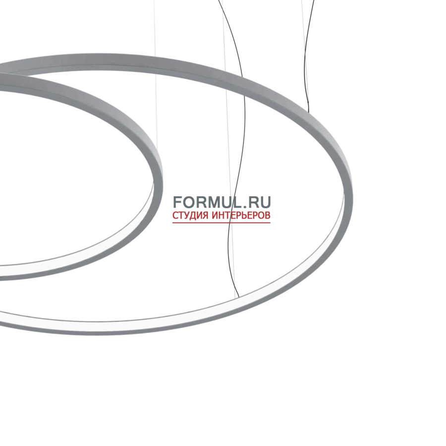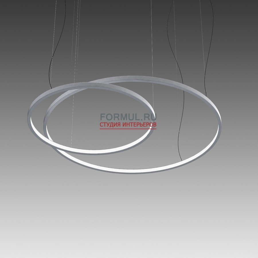Светильник непрямого/рассеянного света, состоящий из согнутых секторов из профильного алюминия, соединенных между собой и формирующих кольца разных диаметров, подвешивается на стальных нитях. Рассеиватель света из белого опалового поликарбоната. Источник света - встроенный светодиод.