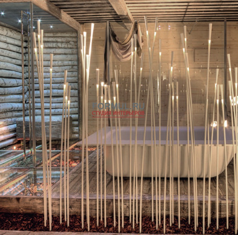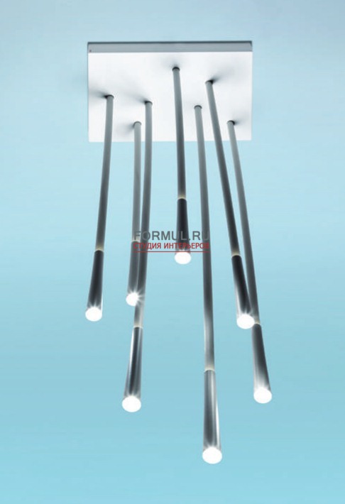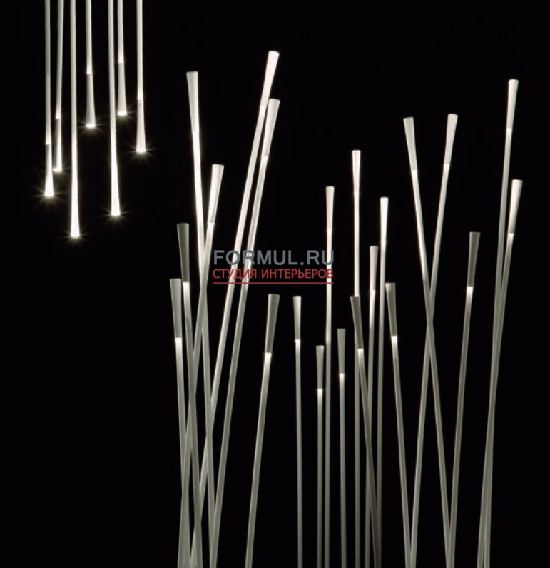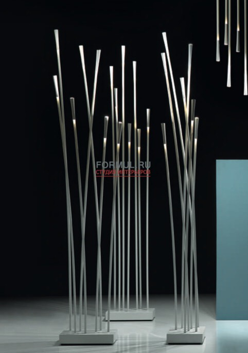 Коллекция состоит из торшера и двух потолочных светильников для внутренних помещений и открытых пространств. Стержни, которые являются рассеивателями света, выполнены из белого пластикового материала, армированного стекловолокном, с источником света на окончаниях. Основа из металла с порошковой окраской белого цвета. Электрическая часть рассчитана на двойную систему светодиодов (24V постоянного тока) от сетевого напряжения, есть отдельный включатель.