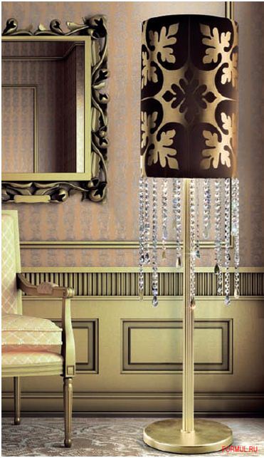 Роскошный торшер из металла украшенного листом золота. Абажур выполнен из шелка цвета эбенового дерева и ацетата цвета золота. Декорирован хрустальными подвесками изготовленными вручную.