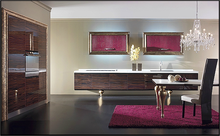 В качестве примера – удивительная кухня Unica, где название говорит само за себя. Это действительно уникальный дизайнерский проект в стиле фьюжн, который базируется на направлении ар деко. Эта кухня – сказка, поразительно красива и максимально функциональна. Модульная система позволяет расположить элементы кухни Unica в зависимости от размера помещения с наибольшим удобством. Производитель предлагает эту коллекцию в различных, самых разнообразных видах отделки. Лакированный шпон ценной древесной породы, глянцевый лак, натуральная кожа и детали, украшенные золотой или серебряной фольгой – всё это каким-то волшебным образом органично сочетается в этой модели, делая её невероятно привлекательной.